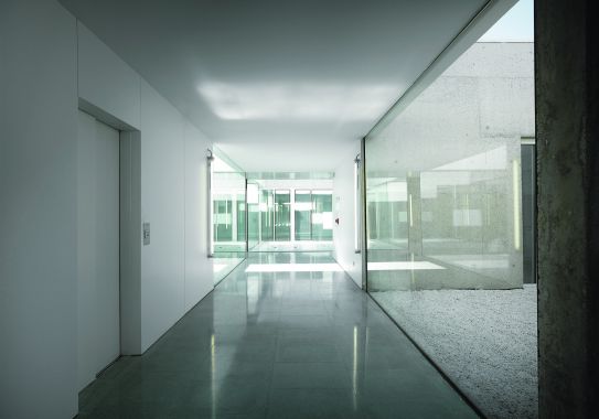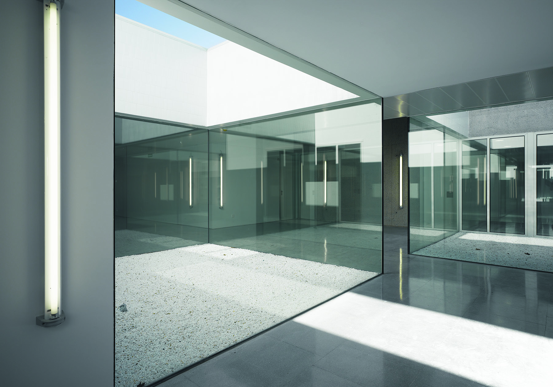 El programa del centro de salud se desarrolla básicamente en una planta baja, aunque existe un sótano para albergar el garaje y parte de las instalaciones del edificio. En planta las distintas dependencias del programa se ordenan generando una parrilla ortogonal irregular poco densa, donde 13 patios se distribuyen al tresbolillo entre las estancias públicas y privadas siguiendo tres (no)-corredores paralelos.