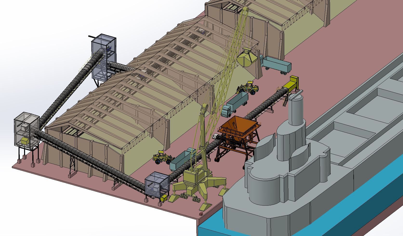 Entre las naves y el cantil hay una franja de 36,5 m y 210 m de longitud para la zona de muelle y operaciones de carga y descarga de buques, así como espacio para la ubicación y operación de grúas de muelle, tolvas, palas y camiones, sistemas de mecanización continuos y cintas de transporte.