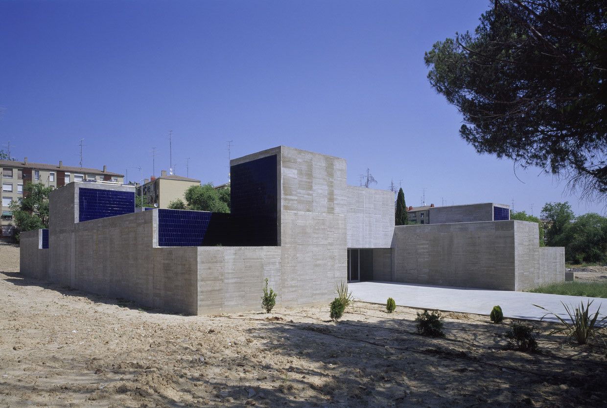 En oposición a este sistema ligero, atomizado por los patios, la fachada rotunda y pesada se concibe como una masa continua y ciega de hormigón visto, con una textura rugosa formada por encofrado de tablas horizontales que principalmente se modula cada 90cm de ancho.